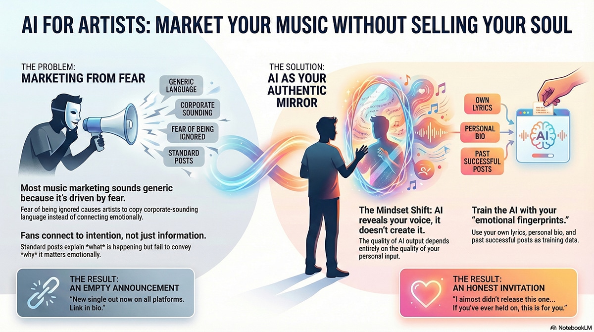 This is not about writing better captions. It’s about building a mindset where AI helps you communicate like a real artist who respects their audience, instead of performing marketing rituals for platforms that don’t care about you. If you hate marketing, this is for you. If you’ve ever posted “new song out now” and felt nothing, this is for you. If you want to sound human, emotional, and unmistakably you, this is for you.