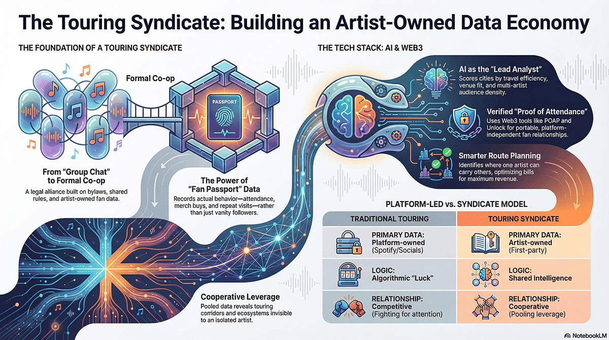 That is the shift. Streaming told artists to compete for attention. A touring syndicate tells them to cooperate around intelligence. One model creates platform dependency. The other creates an artist-owned economy.
