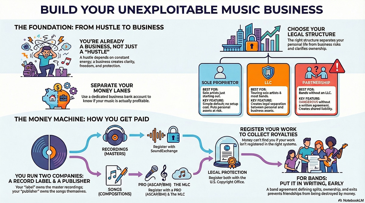 A music business is not just the songs you write or the records you release. It is the system that holds everything together when the music leaves your head and enters the real world. It includes your songs and recordings, but it also includes your name, your brand, your money, your expenses, your contracts, and your rights. A real business exists for three very unromantic but very powerful reasons. It collects money in an organized way. It controls risk so one bad situation doesn’t wipe you out. And it keeps working even when you are exhausted, sick, burned out, or halfway across the country in a broken-down van.