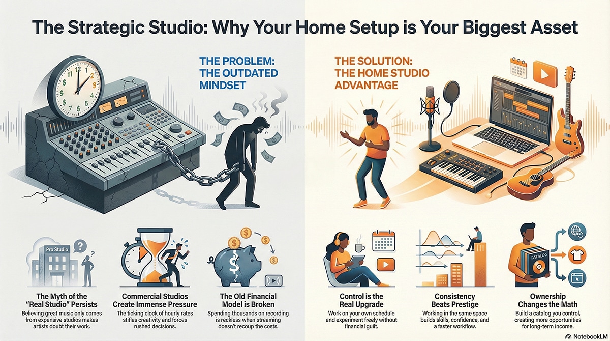 A home studio supports long-term income by enabling volume and consistency, not noise or constant output for the sake of being seen. Real output. Finished songs that add to something larger over time. When you can create and release music regularly without crushing financial pressure, the math of opportunity starts working in your favor.