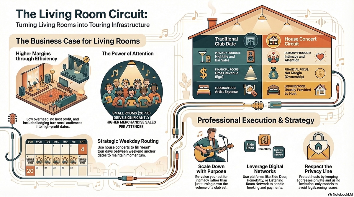 A house concert is not only a destination date. It is one of the best routing tools an independent artist can have. It can turn dead calendar space into useful, profitable motion.