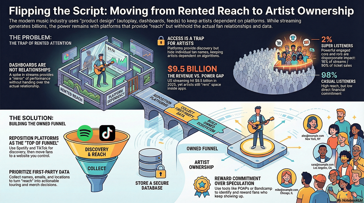 The next generation of working indie artists will not win by renting attention better than everyone else. They will win by turning discovery into ownership, turning data into decisions, and turning casual listeners into committed supporters.