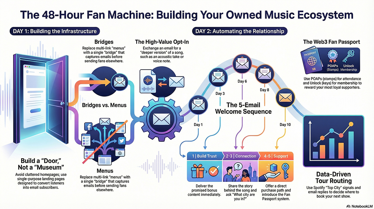 The goal of this weekend build is simple. By Sunday night, you should have a working pipeline that takes a listener from Spotify discovery to your owned channels, then nudges them toward deeper engagement and direct support. Not by manipulating anyone. By giving them something worth opting into.